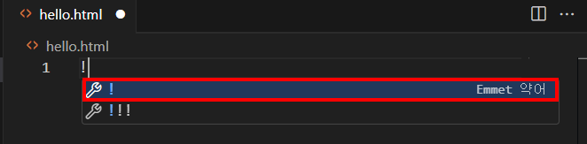 아까 만든 HTML 문서에 !를 입력한 다음 "!"를 클릭하면 (or 방향키 아래 > Enter) 빠르게 HTML 기본 구조가 완성됩니다.