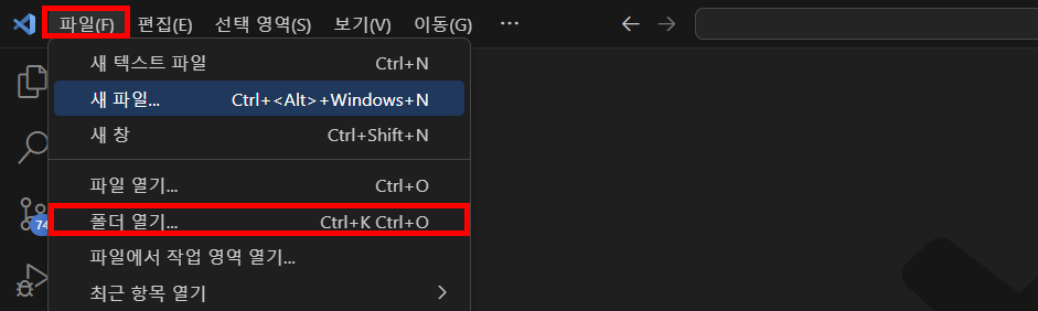 "파일 > 폴더 열기"로 이동해, 아까 만든 "프로젝트" 폴더로 이동해 줍니다.